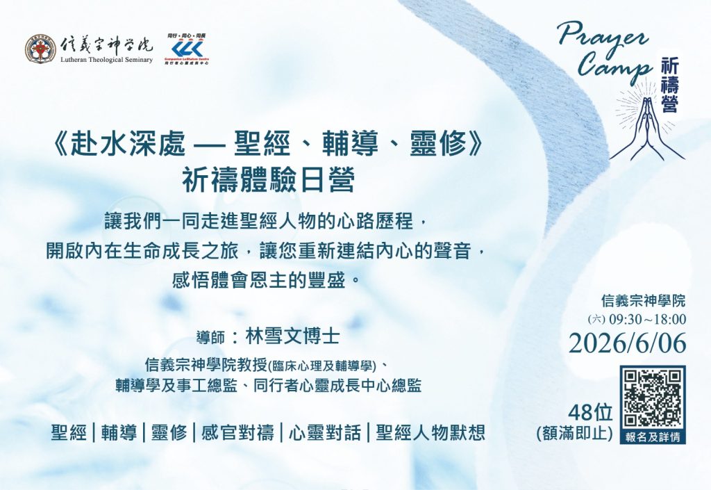 每位參加者可獲贈《 赴水深處——聖經、輔導、靈修》書籍乙本