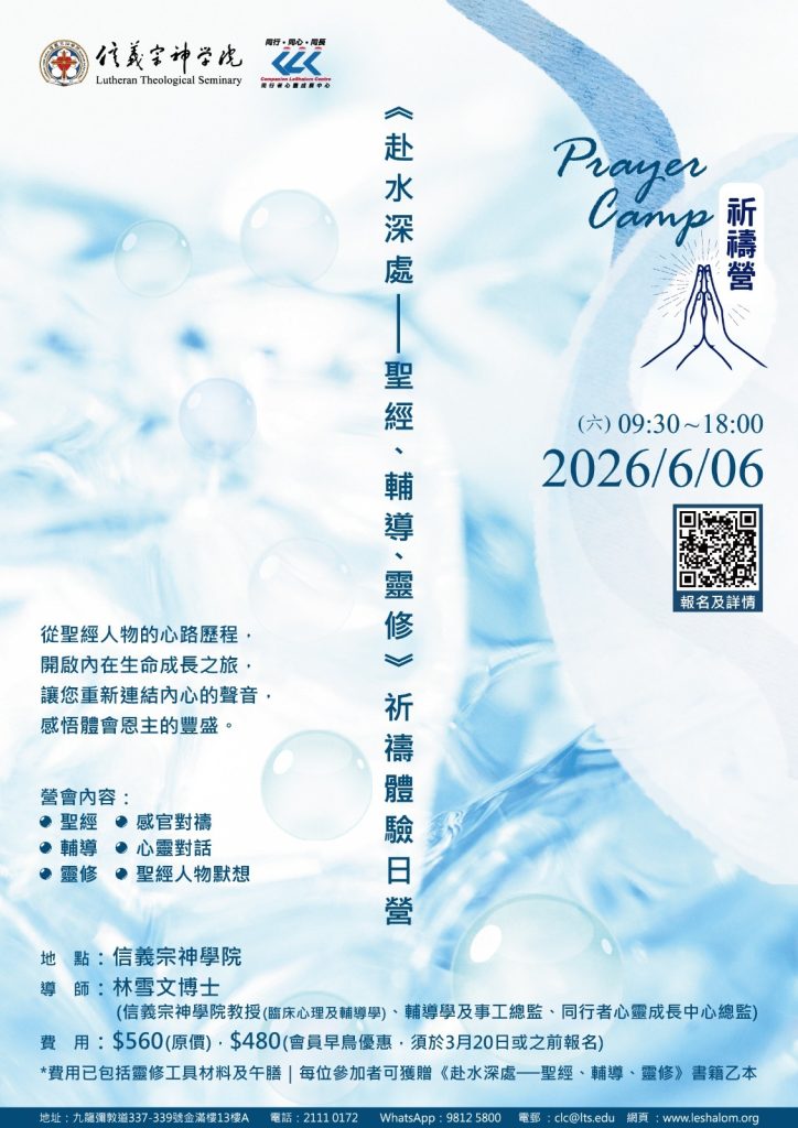 每位參加者可獲贈《 赴水深處——聖經、輔導、靈修》書籍一乙本