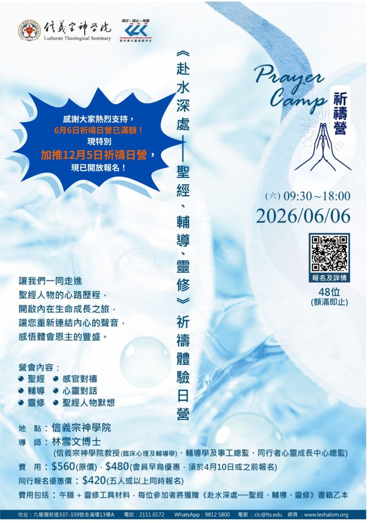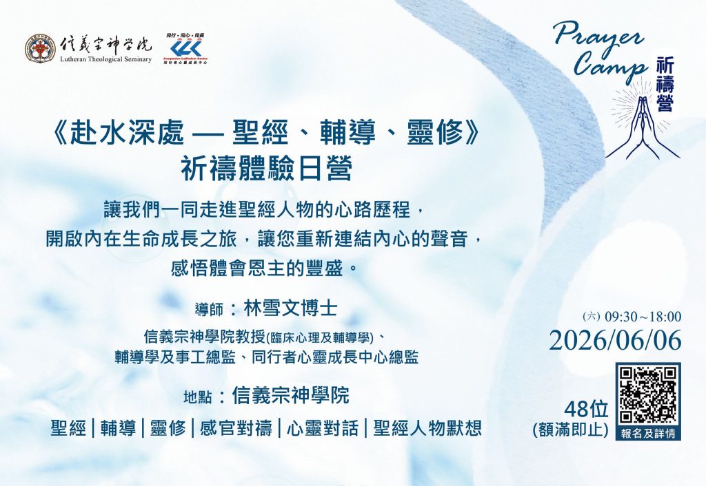每位參加者可獲贈《 赴水深處——聖經、輔導、靈修》書籍乙本