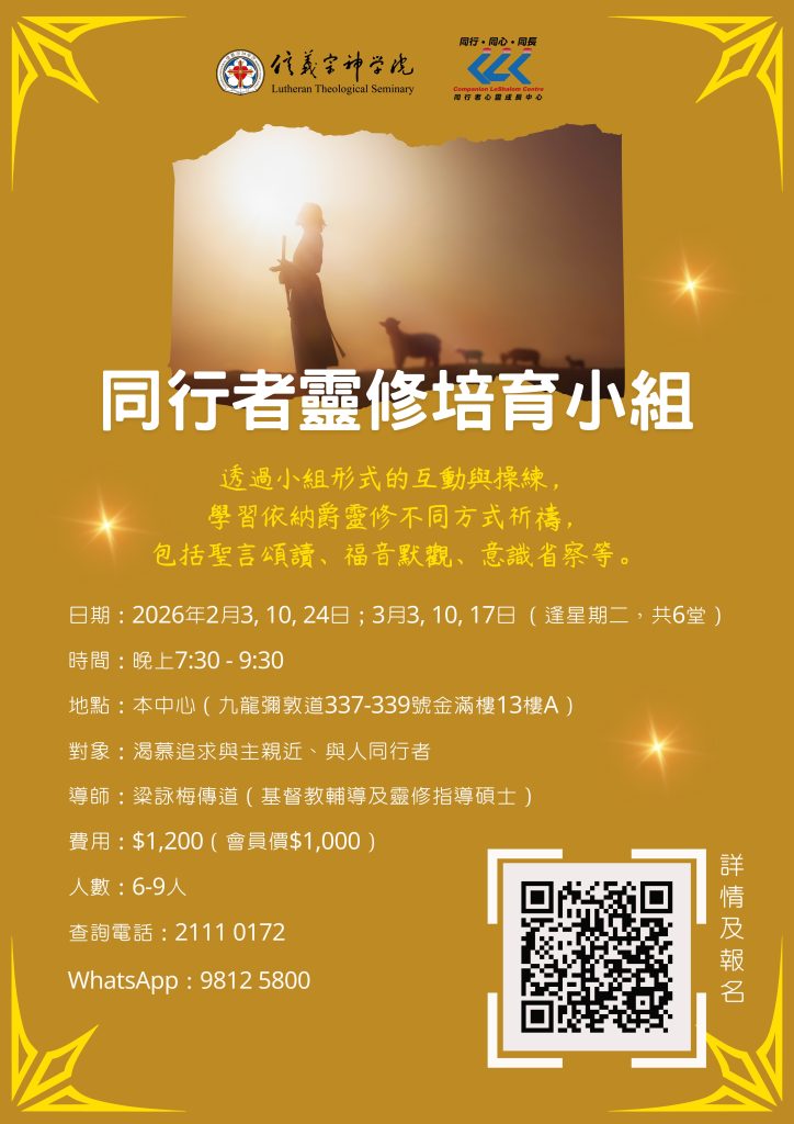 簡介:禱告是叫我們意識與上主的關係,人若未能意識這份關係,就可能會對生命的意義感到焦慮。本課程著重實踐,附以理論學習,豐富參加者對靈修禱告操練的認知及經驗。透過小組形式的互動與操練,學習依納爵靈修較常用的祈禱方式,包括靈閱、福音默觀、意識省察等,幫助參加者更新禱告和靈修生活,有意識地整頓內心,更敏銳神慈愛的同在和引導,建立渴慕神和效法基督的生命,深化與神的關係,塑造更自由和穩健的心靈與人同行。